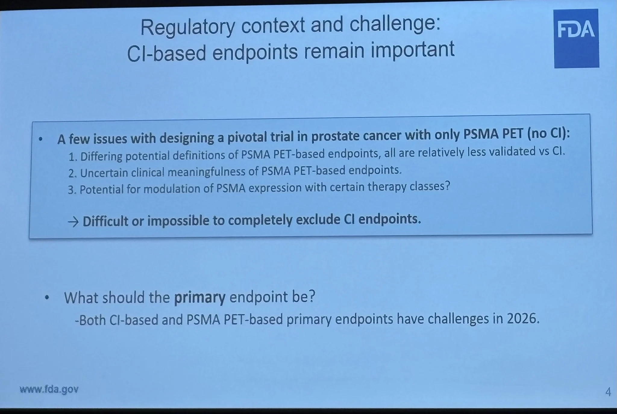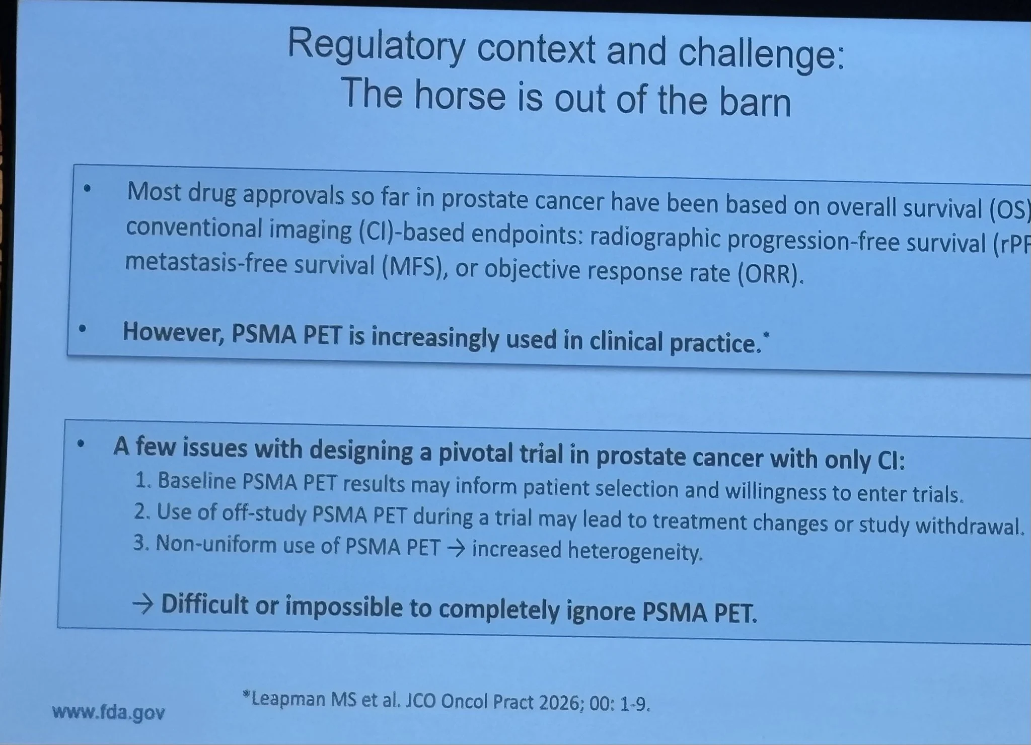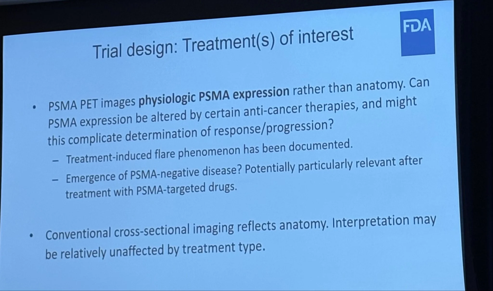 Many great presentations projecting potential of PSMA but also a thoughtful if not sobering talk by Dr. Will Maguire, FDA Oncology.