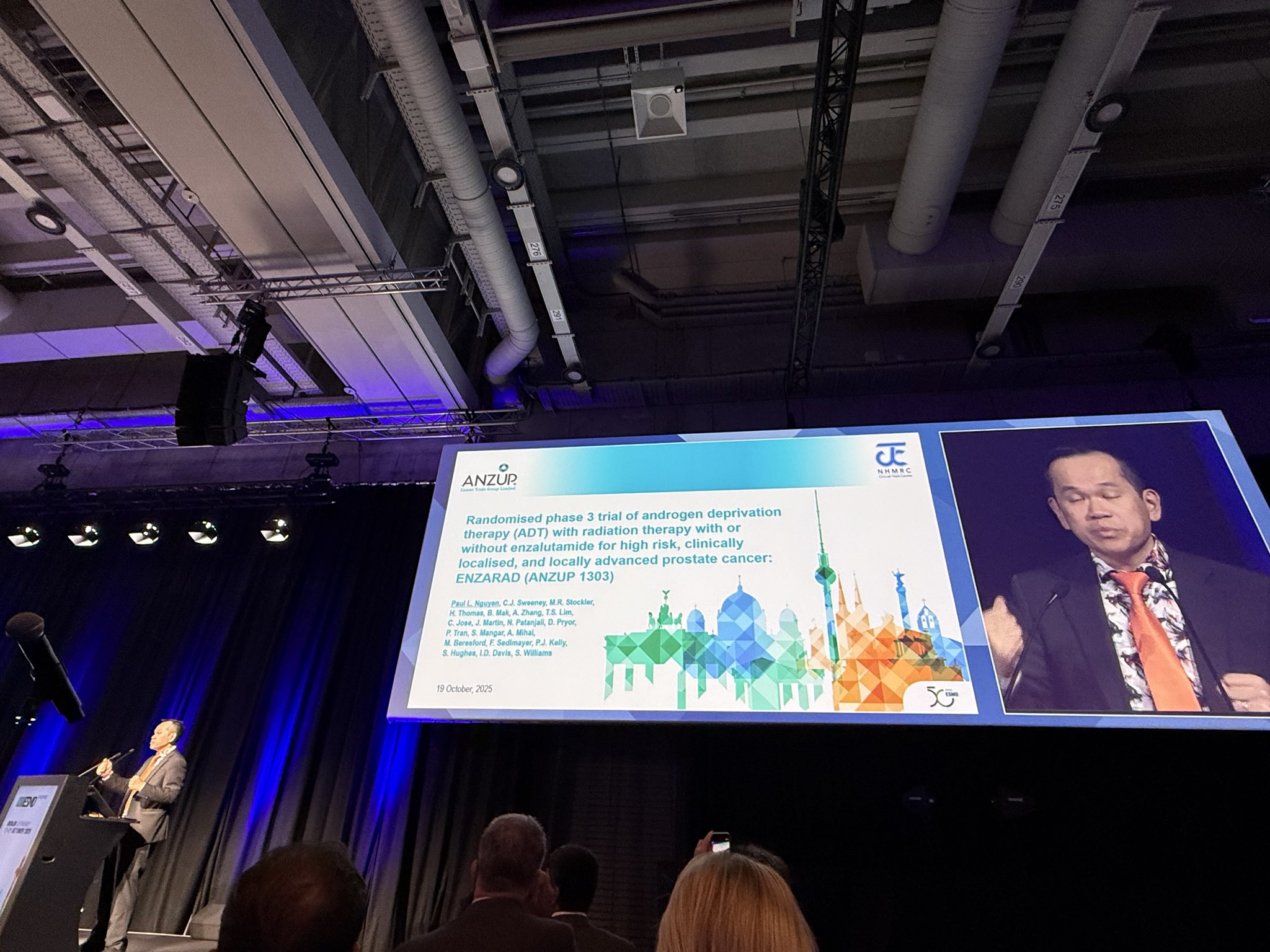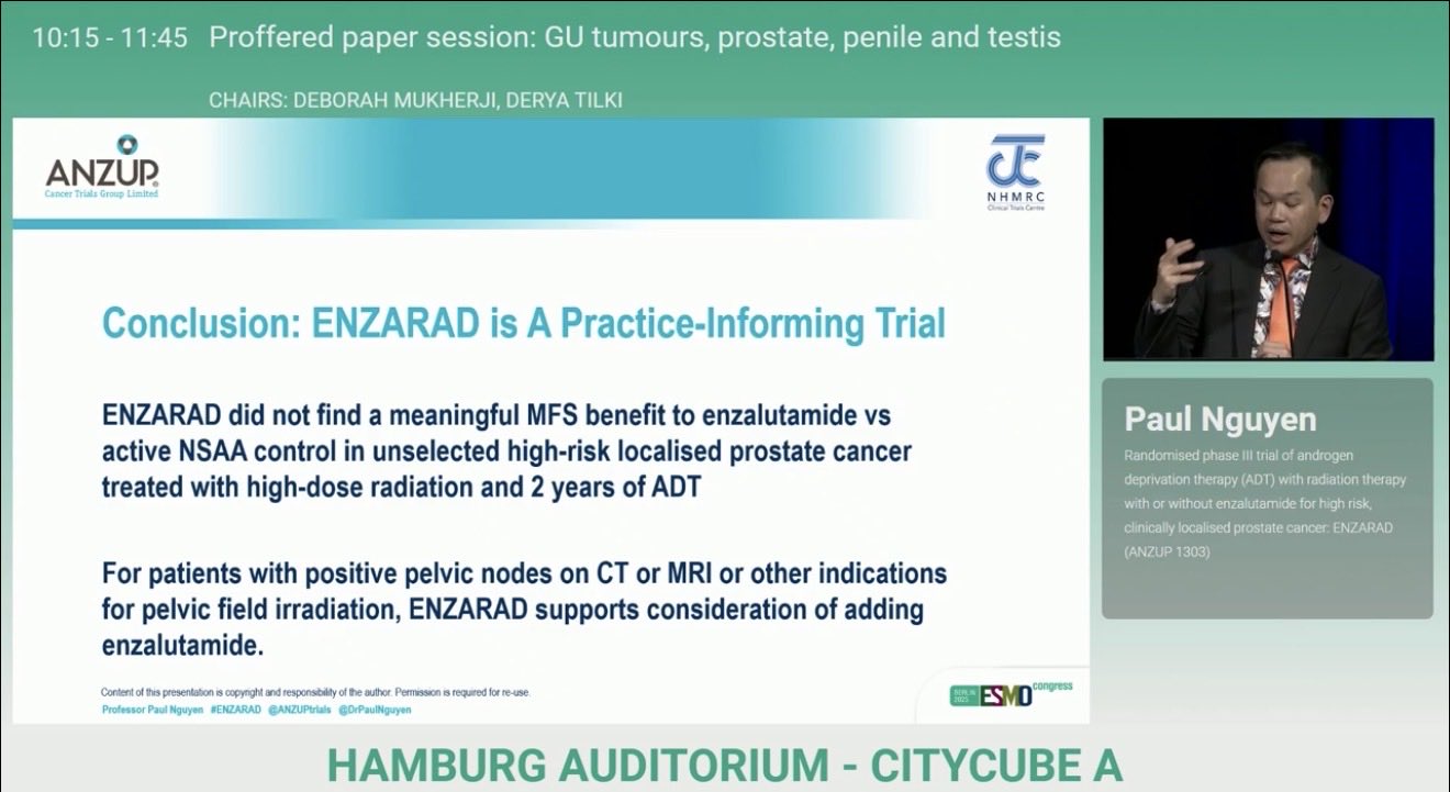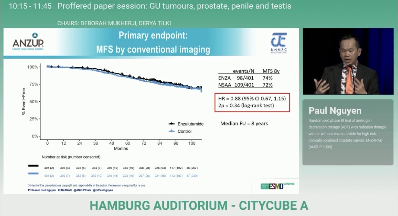 “Fantastic talk by Paul Nguyen at ESMO25, result of Ph3 Enzarad trial. The addition of ENZA to ADT + radiation did not improve MFS in all high-risk localized patients, the primary endpoint. However, node+ on CT/MRI patients derived benefit, like the Stampede trial.”