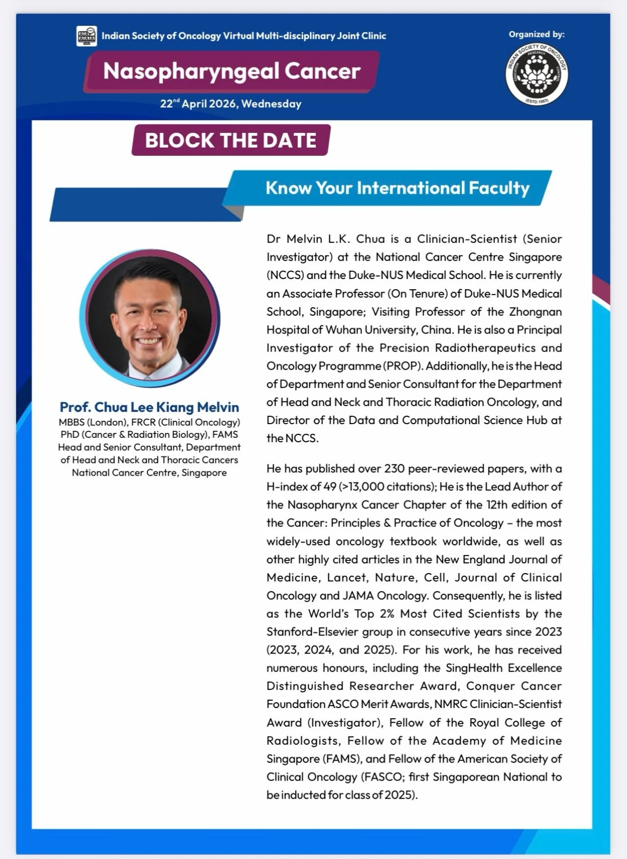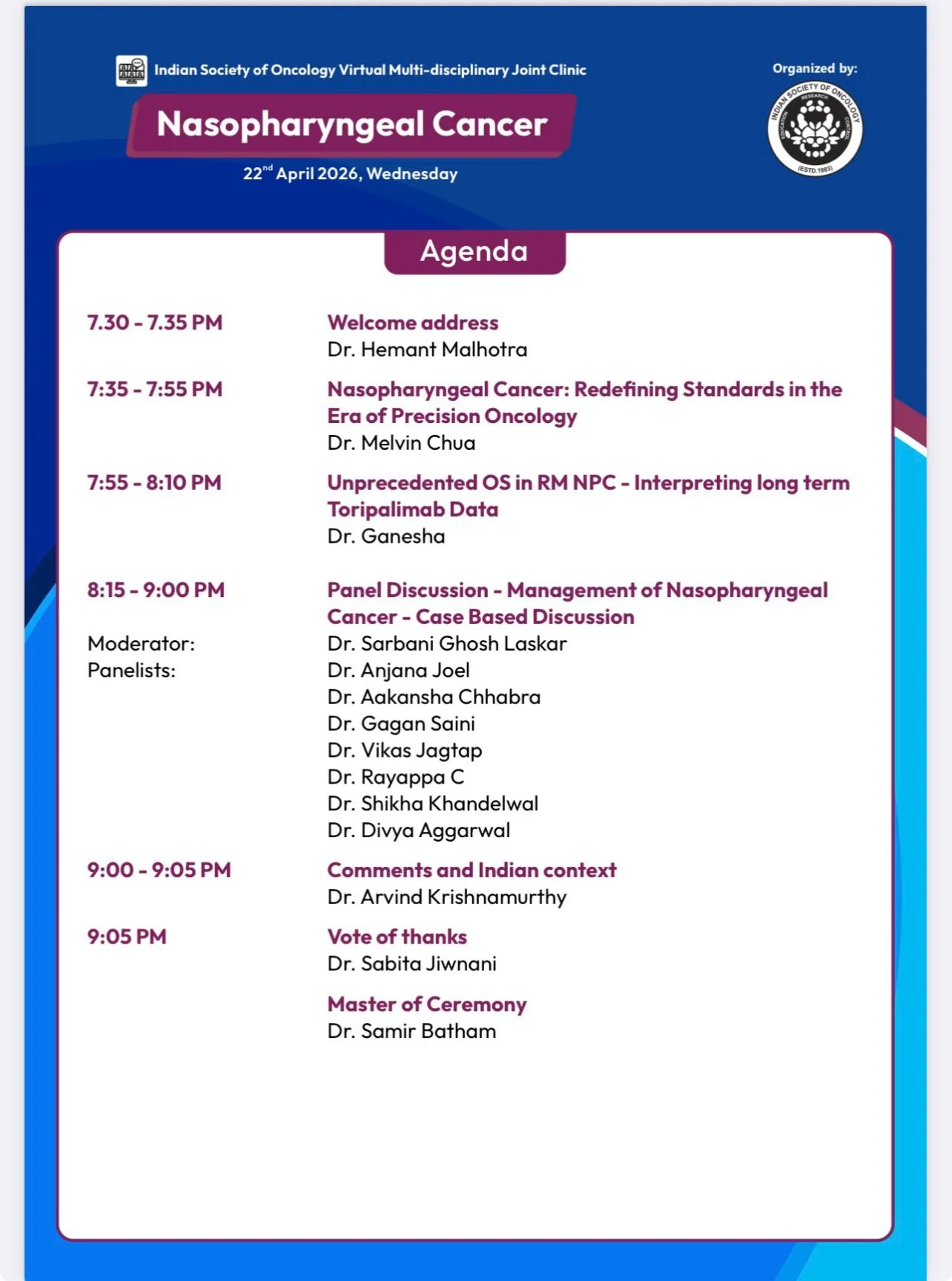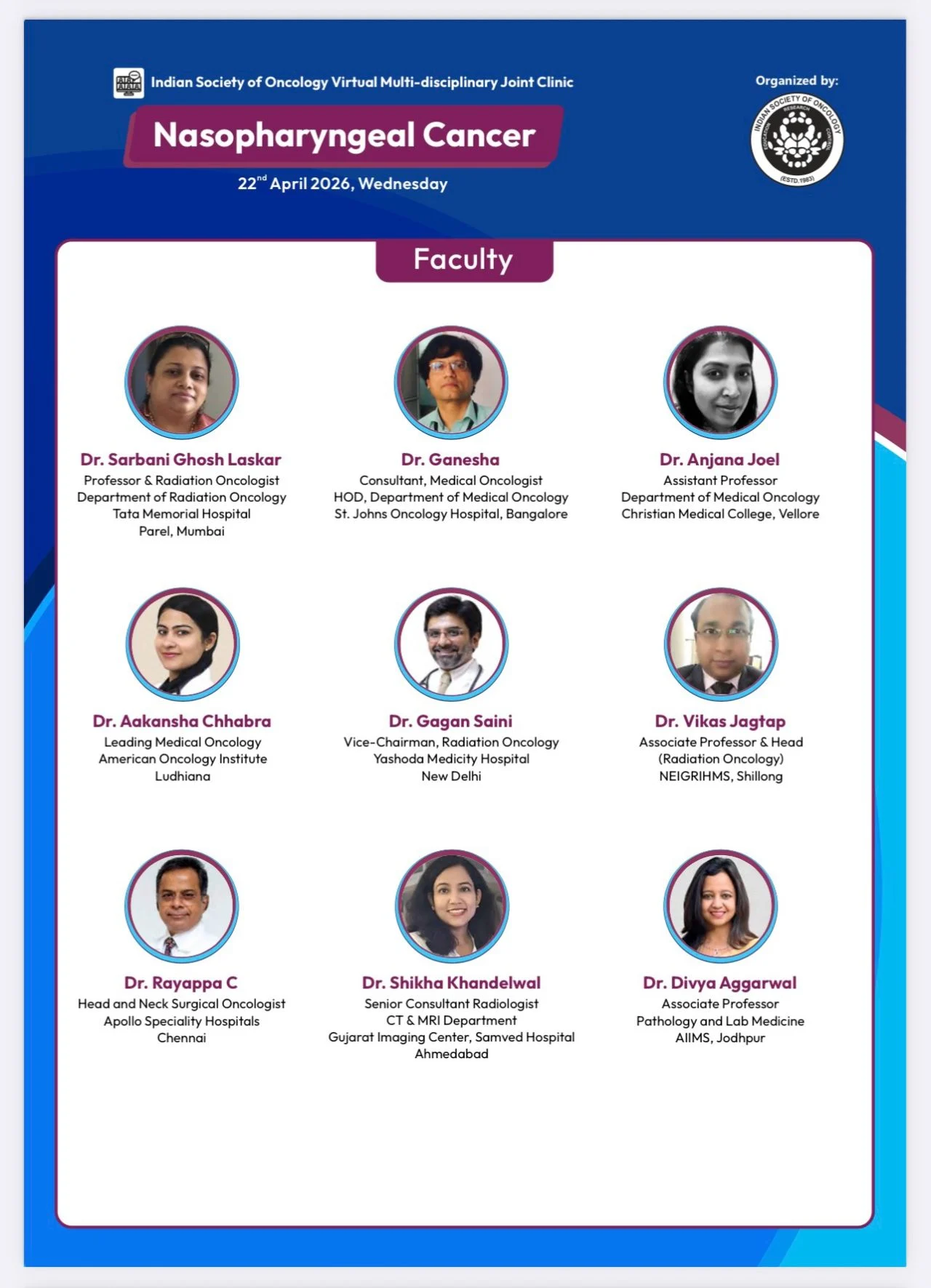 The Indian Society of Oncology (ISO) presents a Virtual Multi-disciplinary Joint Clinic on Nasopharyngeal Cancer on 22nd April 2026, 7:30-9:05 PM, featuring renowned international and national faculty, cutting-edge insights in precision oncology, and an engaging case-based panel discussion-perfect for residents and consultants looking to sharpen their clinical approach in managing these cancers.
