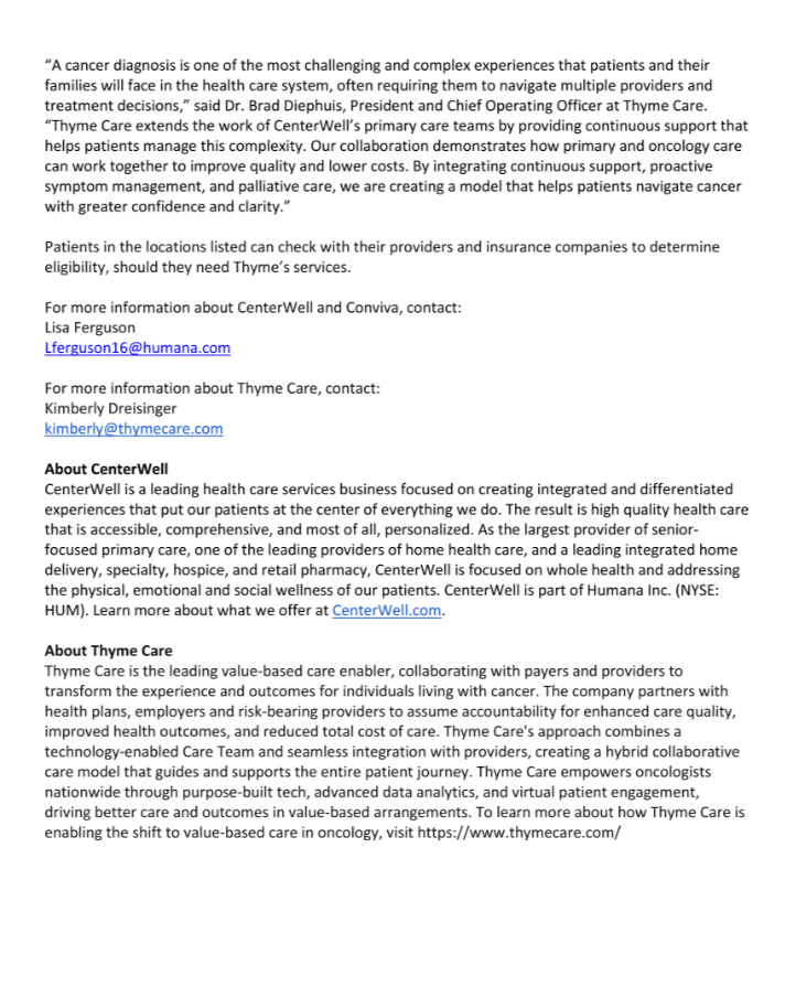 “CenterWell’s partnership with Thyme Care means CenterWell Senior Primary Care and Conviva Senior Primary Care patients in Florida, Georgia, Nevada, North Carolina, South Carolina, Tennessee, and Texas on cancer journeys receive additional support to navigate and understand their care, closely aligned to the teams in our primary care centers. Patients gain a layer of additional support during a critical time, and our providers can count on Thyme’s trusted team to ensure the best outcomes possible for each patient.