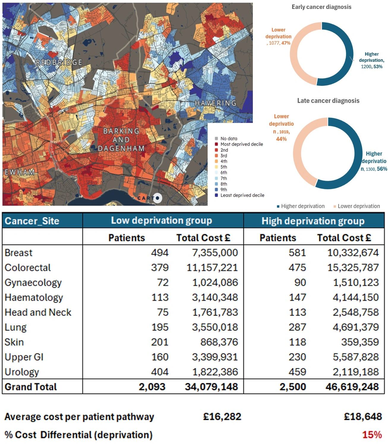 Early vs. Late Diagnosis Costs: The average Direct cost of treatment for cancers detected early (Stages 1 and 2) is less than half the cost of those diagnosed late (Stages 3 and 4), at £11.2K vs. £23.8K per pathway.