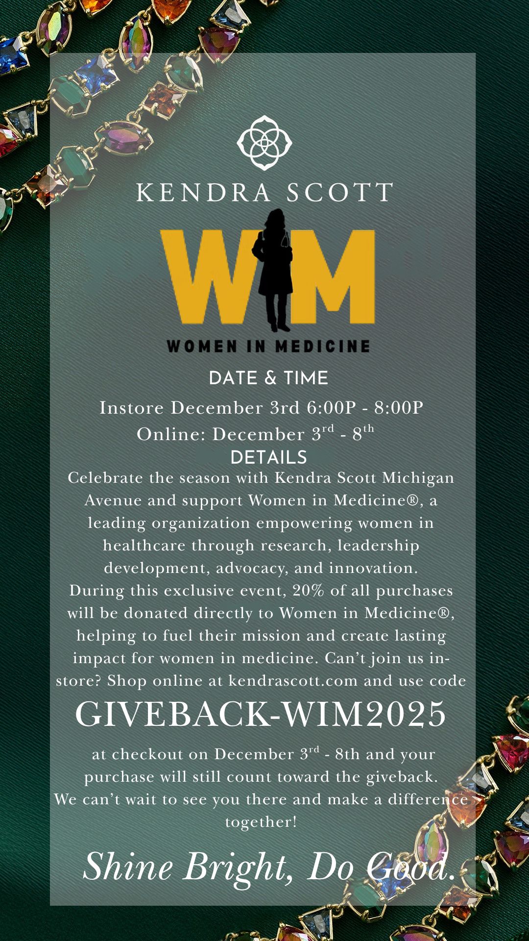 I’m excited to share that Kendra Scott Michigan Avenue is partnering with Women in Medicine again this year for a special give-back event!