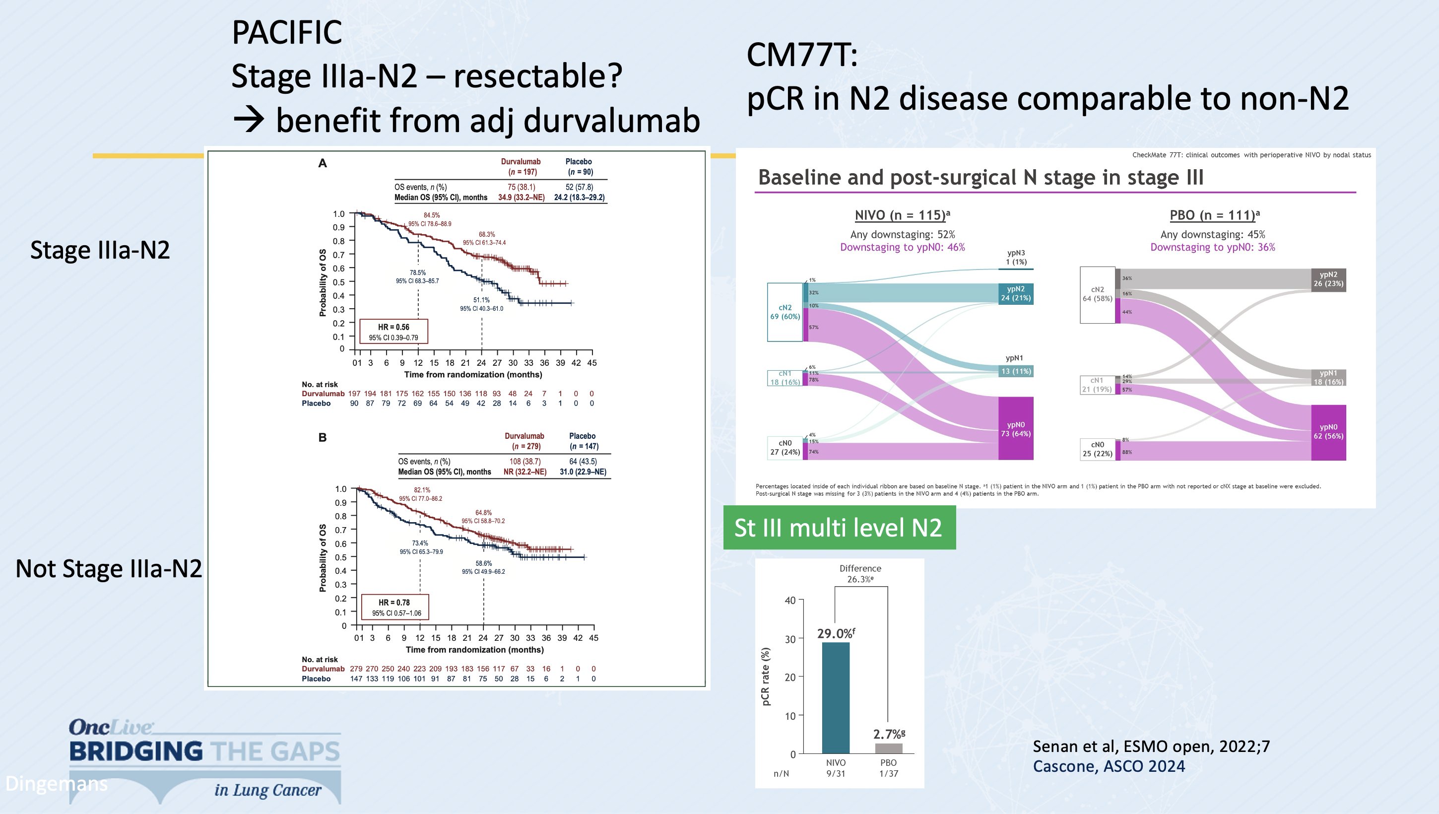 Concurrent chemoradiation and consolidation durvalumab remains the standard for unresectable stage III NSCLC. For resectable N2+, perioperative chemoIO outcomes encouraging.”