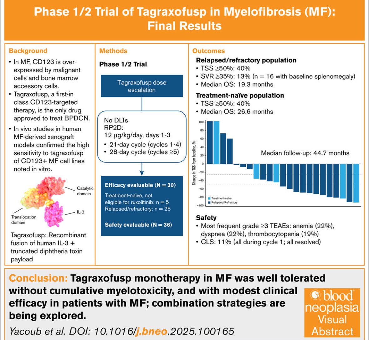 ”Just out in Pubmed – Ph 1-2 results of Tagraxofusp monotherapy in R/R Myelofibrosis (MF).