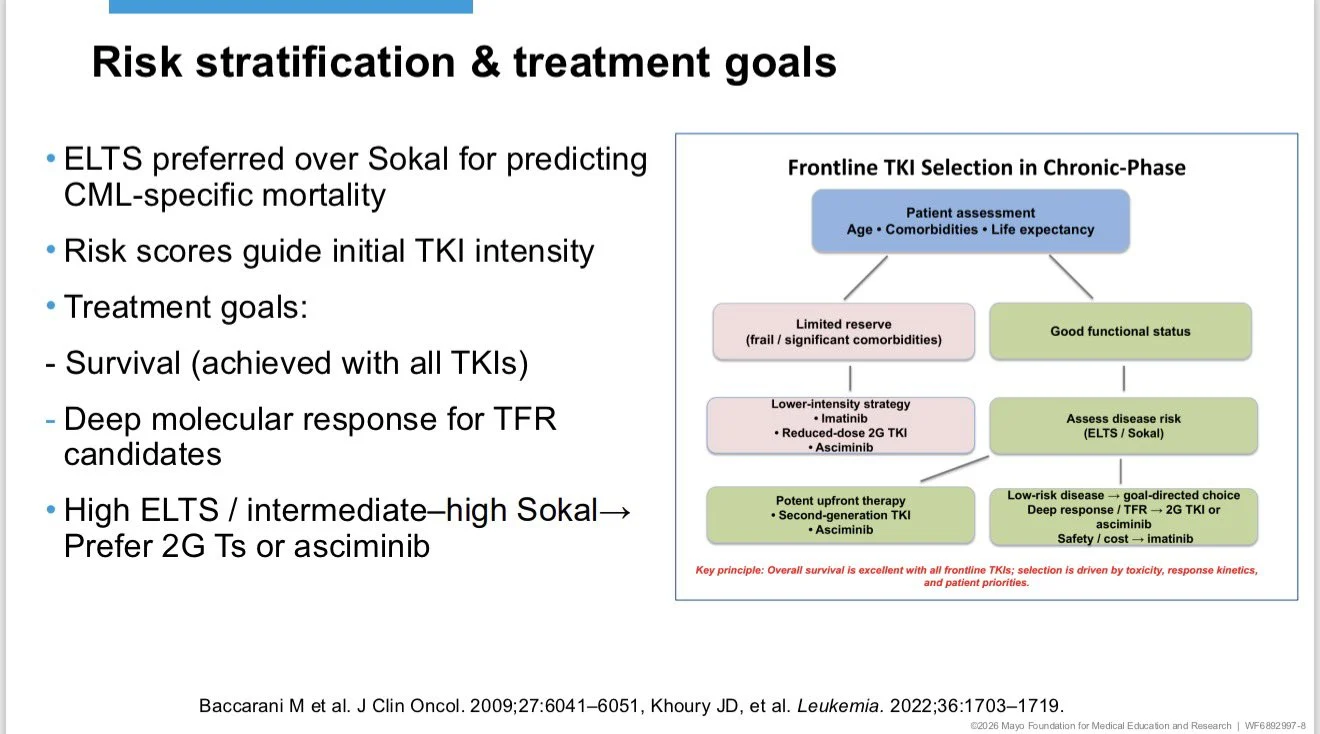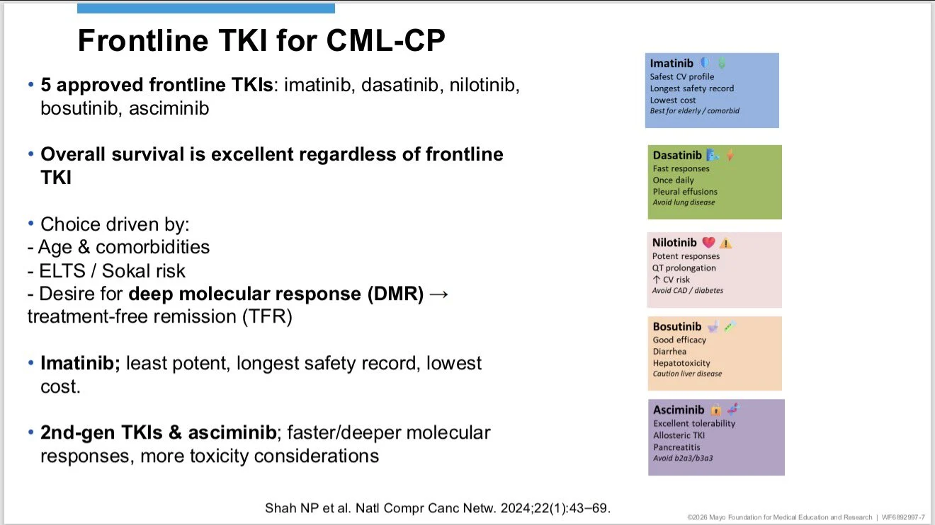 - Choice ≠ OS → it’s about risk (ELTS>Sokal), comorbidities, toxicity, and DMR/TFR goals.