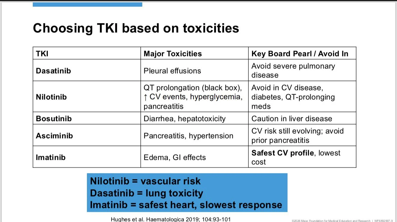 Nilotinib → vascular risk. Dasatinib → lung toxicity. - Asciminib → allosteric, avoid b2a3/b3a3.