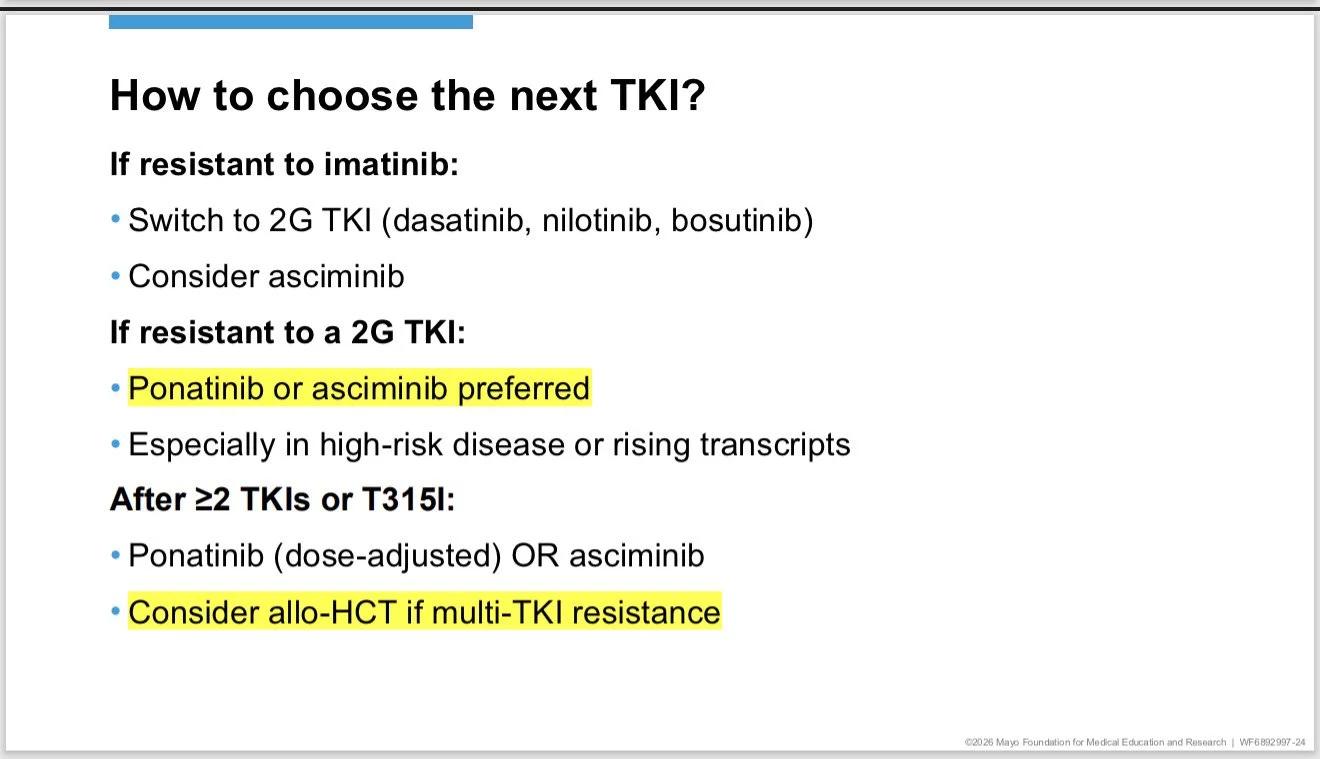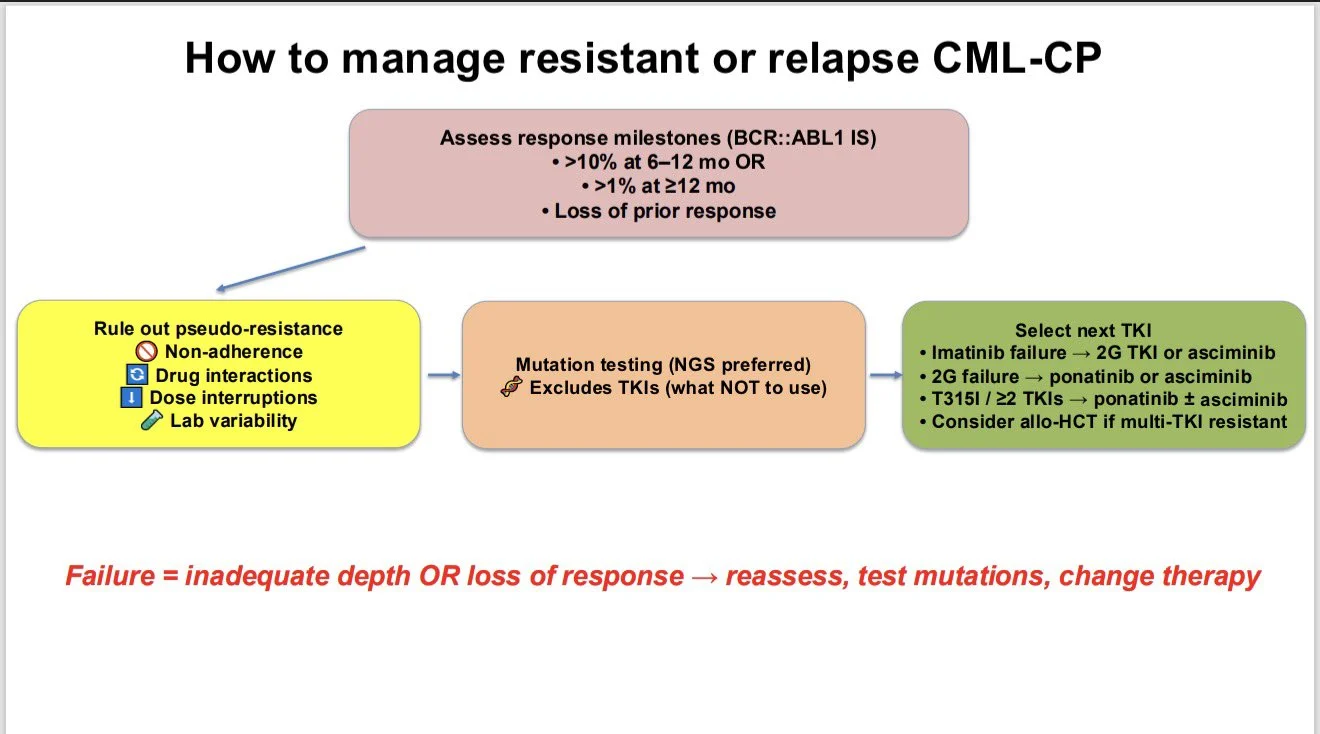 • Imatinib failure → 2G TKI (dasatinib, nilotinib, bosutinib) or asciminib