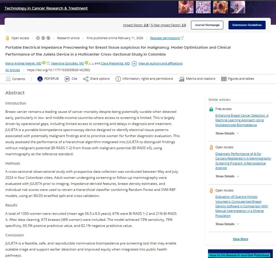 “New article from Technology in Cancer Research and Treatment Journal about JULIETA, a noninvasive bioimpedance pre-screening tool for detecting breast cancer.”