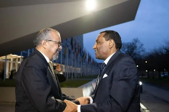 “Pleasure to welcome HE Prof Kamil Idris, Prime Minister of Sudan to World Health Organization (WHO)’s headquarters in Geneva. We appreciate this visit.