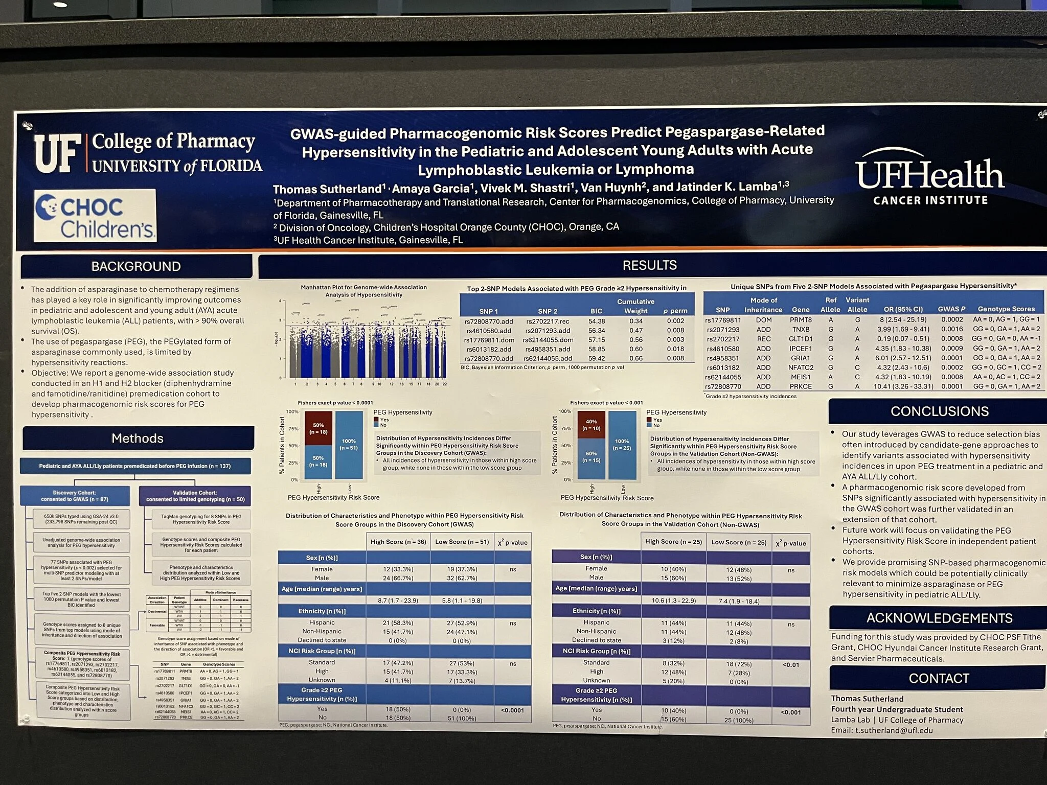 My research focuses on Pegaspargase (PEG) hypersensitivity reactions during the treatment of pediatric leukemia and lymphoma. We leveraged genome-wide data to develop a polygenic risk score that could one day help clinicians adjust PEG treatment, hopefully leading to fewer allergic reactions. I’m very grateful to be part of such meaningful research, and I’m honored to have the opportunity to present this project.”