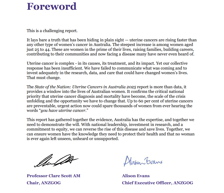The Australia New Zealand Gynaecological Oncology Group (ANZGOG) reported this landmark, evidence-based report, which draws on national data, clinical research, and lived experience to reveal the true size, scale, and growing impact of uterine cancers across the country.