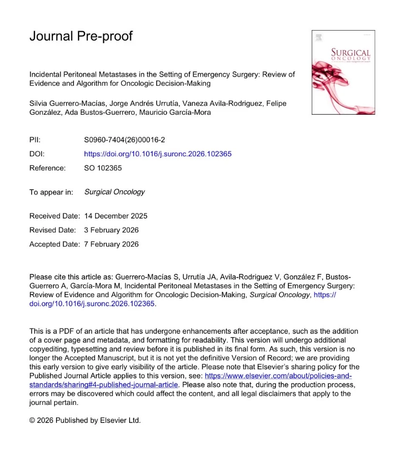 “Proud to share our publication in Surgical Oncology: “Incidental Peritoneal Metastases in the Setting of Emergency Surgery.” An evidence-based algorithm to guide oncologic decision-making in complex emergency scenarios. Congratulations to Siivia Guerrero and Andrés Urrutía.”