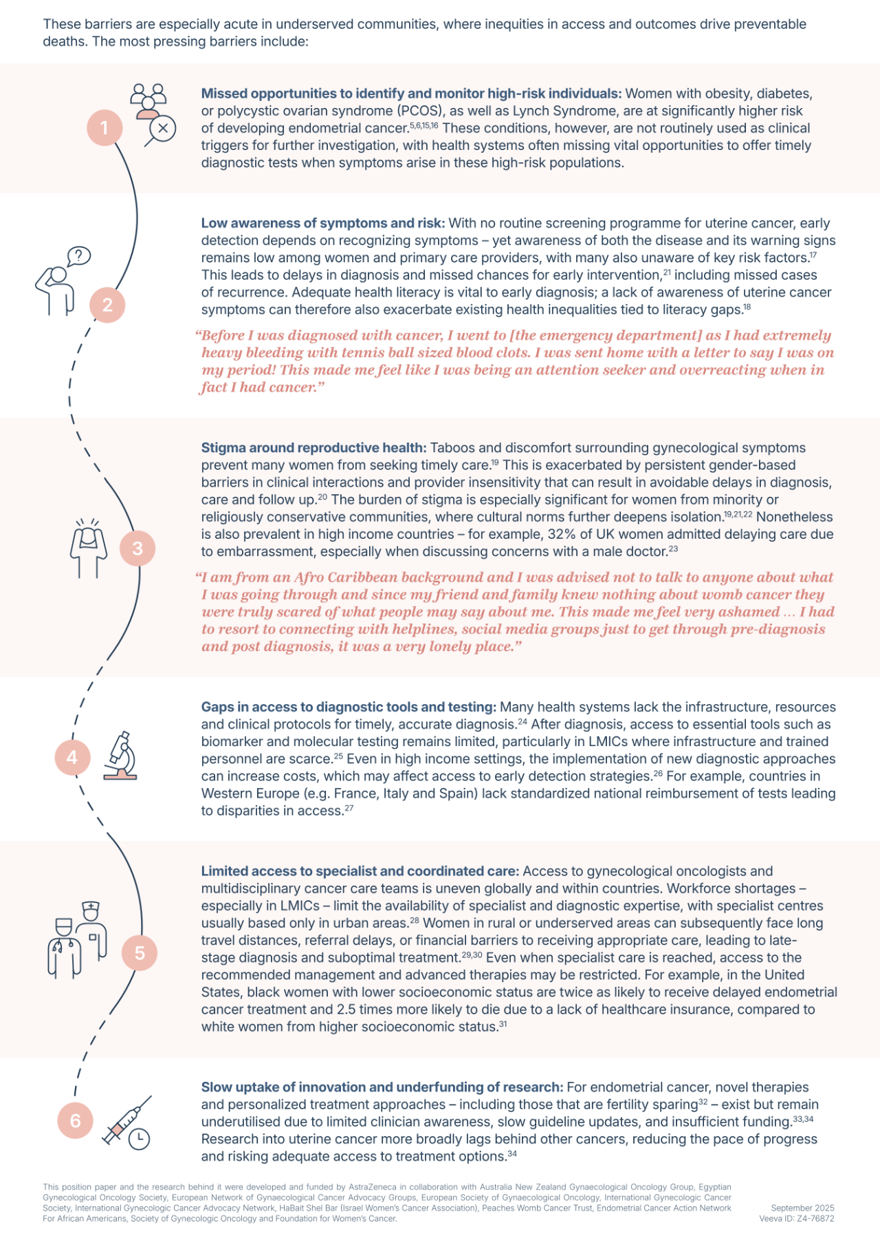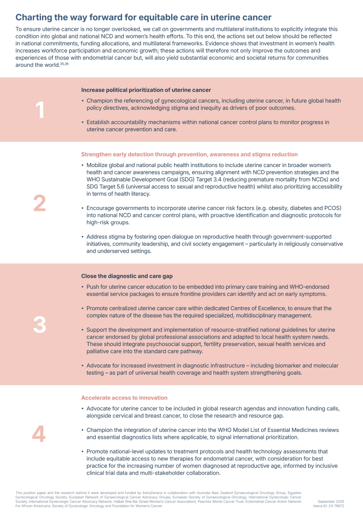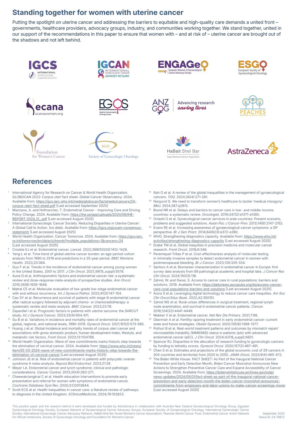 International Gynecologic Cancer Society , European Society of Gynaecological Oncology , ESGO ENGAGe , Society of Gynecologic Oncology , The Foundation for Women’s Cancer , Australia New Zealand Gynaecological Oncology Group (ANZGOG) , ECANA Women Endometrial Cancer Action Network for African-Americans, HaBait Shel Bar – Israel’s Women’s Cancer Association (RA) , Egyptian Gynecological Oncology Society, and Peaches Womb Cancer Trust have joined forces with AstraZeneca to co-author this paper and ensure women at risk of, or living with, uterine cancer are no longer left behind.