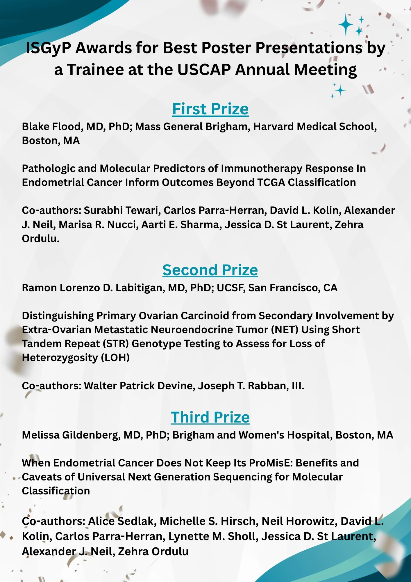 “The International Society of Gynecological Pathologists Education Committee proudly congratulates the recipients of ISGyP trainee presentation awards at USCAP Texas, March 2026!”